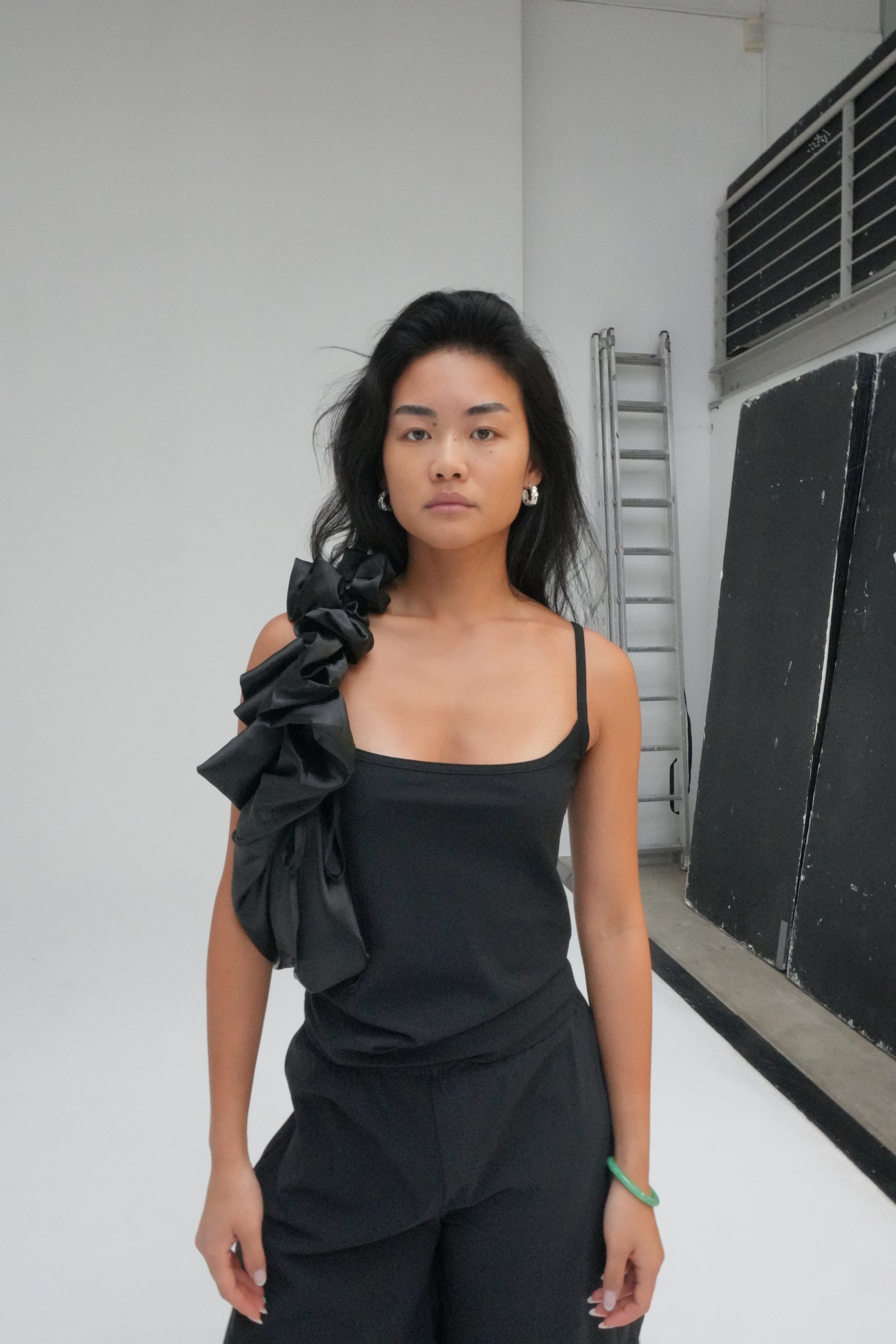 The eye-catching Shirley bag is crafted from luxurious black recycled polyester. Featuring an adjustable strap and ruffle detailing. Can be worn around the shoulder, crossbody, or as a handbag.