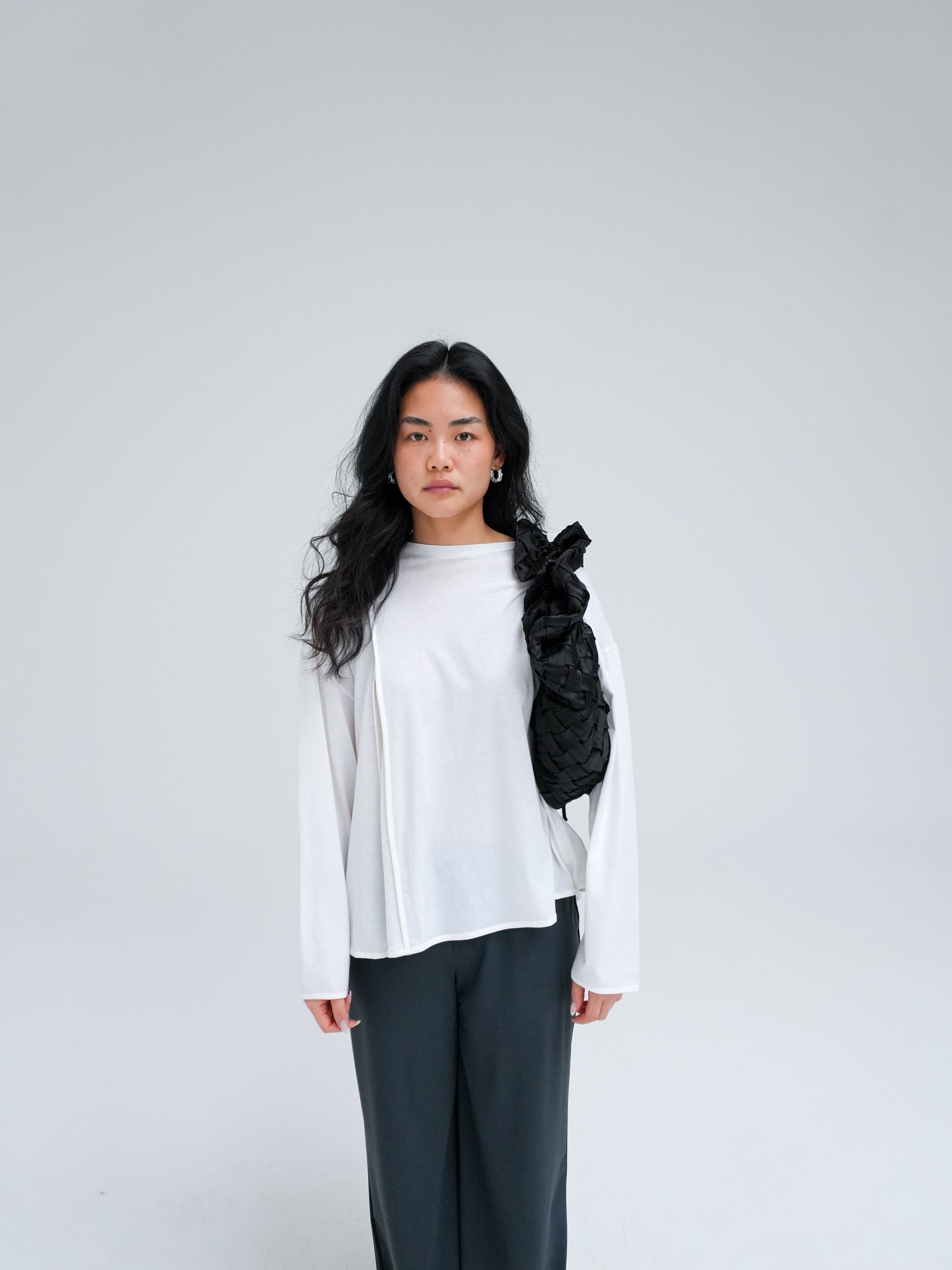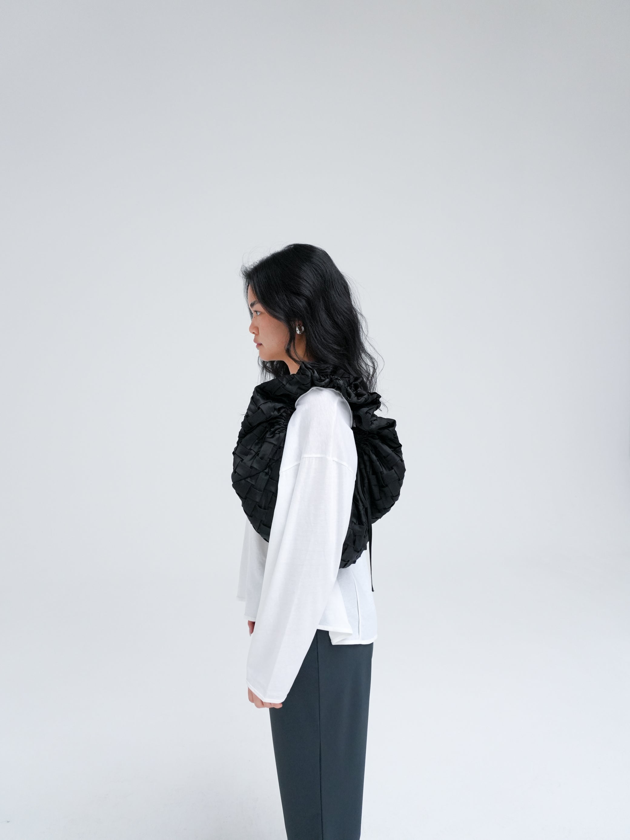 The Shirley Bag is reimagined in a new woven design, crafted from 100% recycled polyester in black. Its soft, ruched construction and sculptural silhouette make it a statement accessory. Finished with an adjustable strap, it can be styled around the shoulder, crossbody, or carried as a handbag.