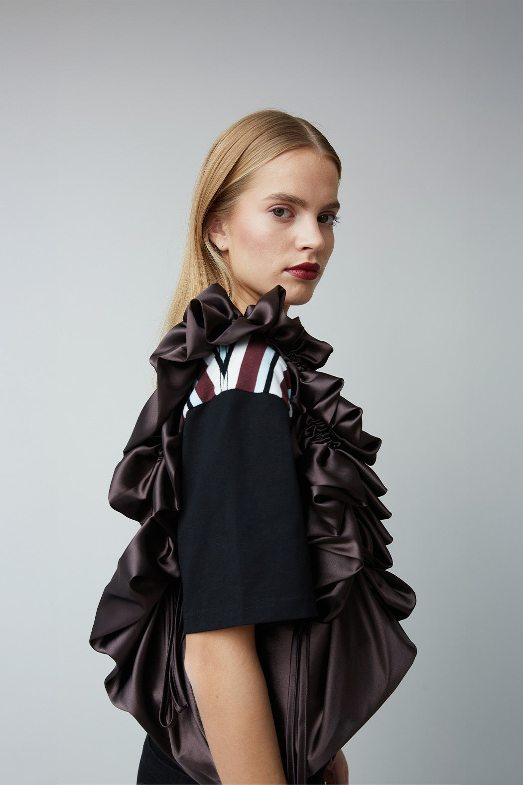 The eye-catching Shirley bag is crafted from luxurious brown recycled polyester. Featuring an adjustable strap and ruffle detailing. Can be worn around the shoulder, crossbody, or as a handbag.