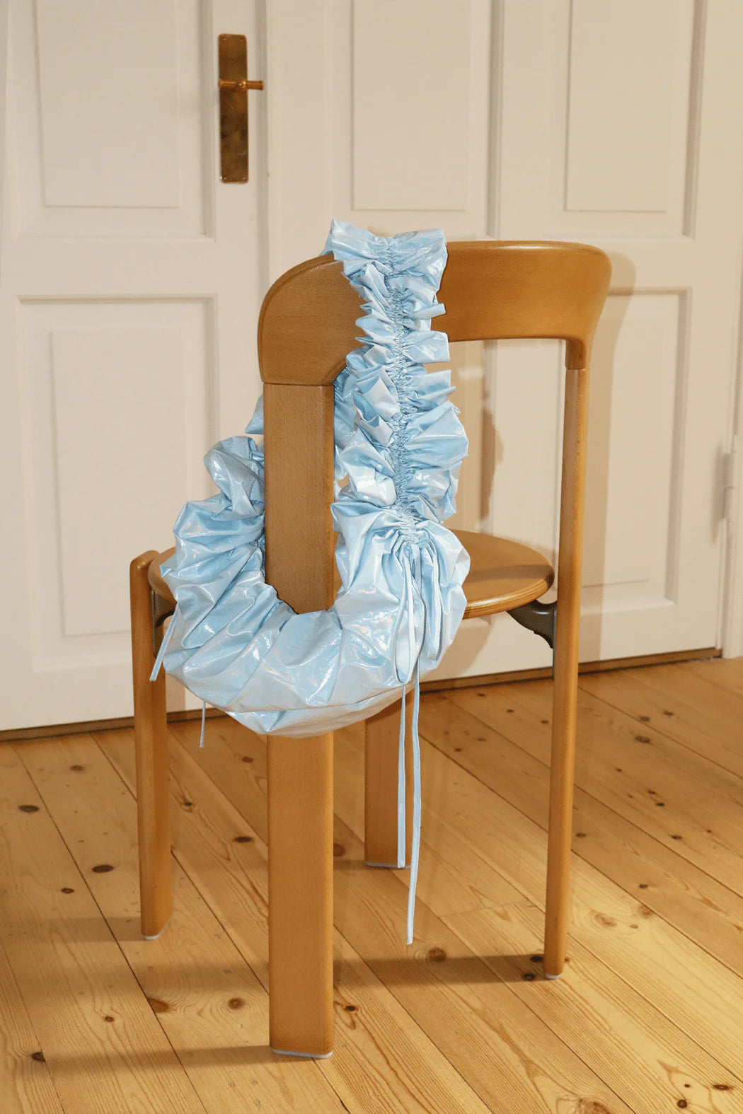 The eye-catching Shirley bag is crafted from 100% recycled blue polyester. Featuring an adjustable strap and ruffle detailing. Can be worn around the shoulder, crossbody, or as a handbag.