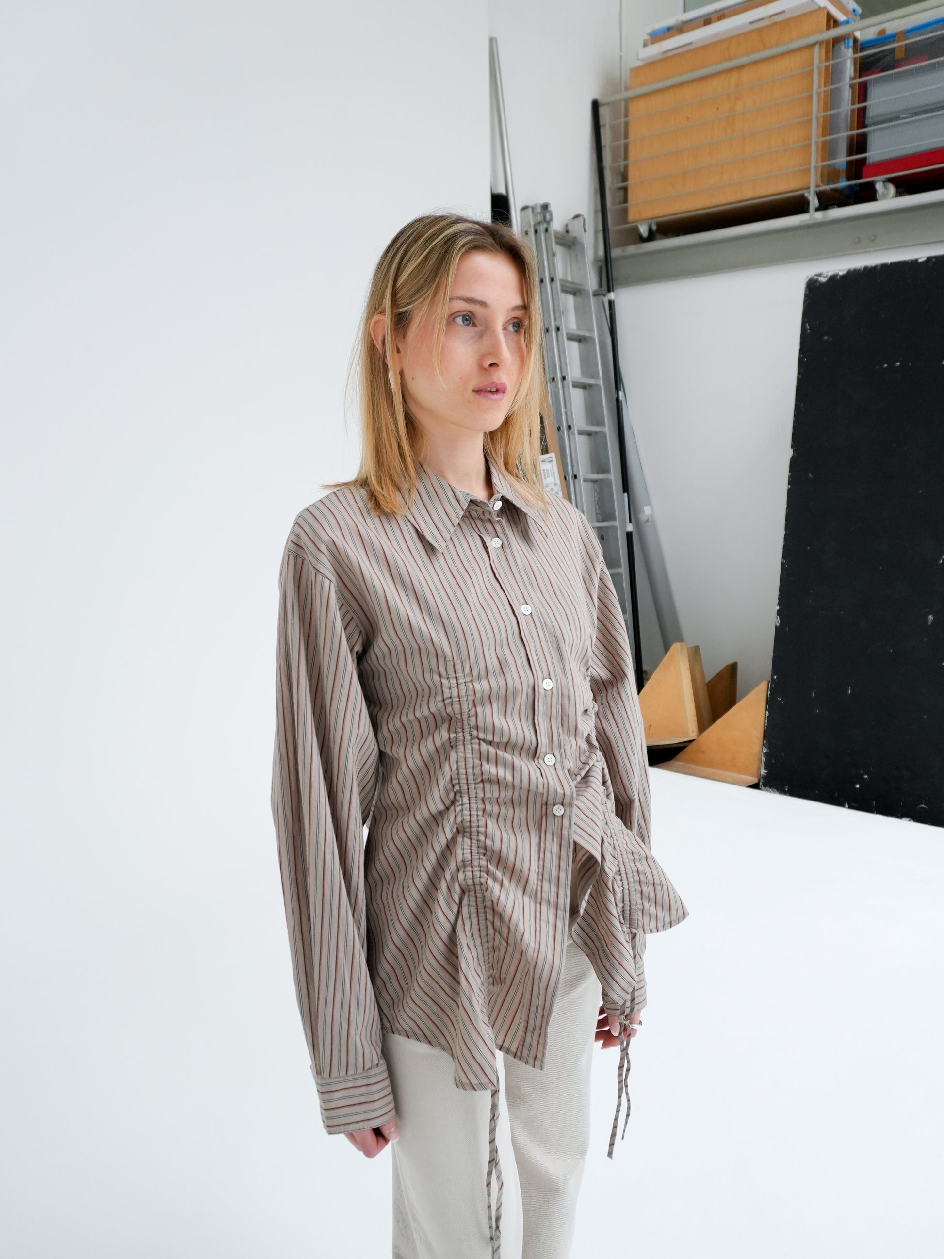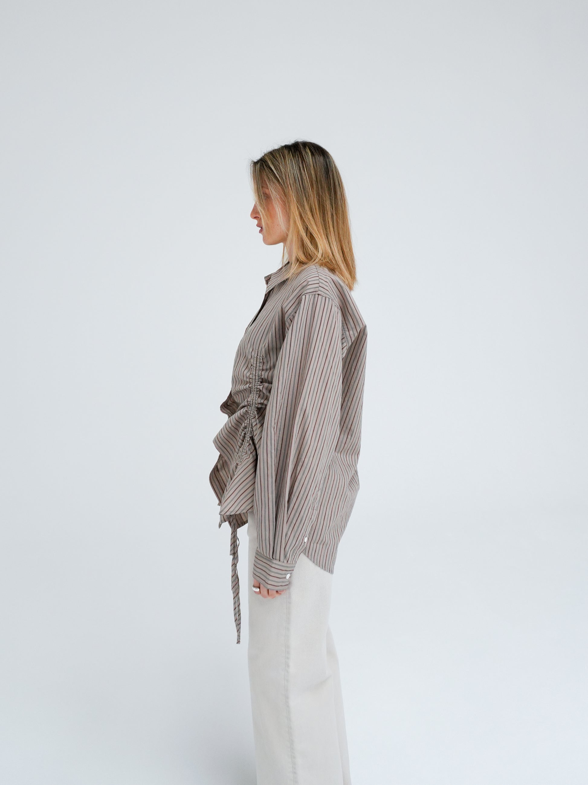 String Shirt is a relaxed shirt with a drawstring detail in the front. When pulled, the drawstring creates gathers. Crafted from a cotton poplin with a slightly irregular texture.