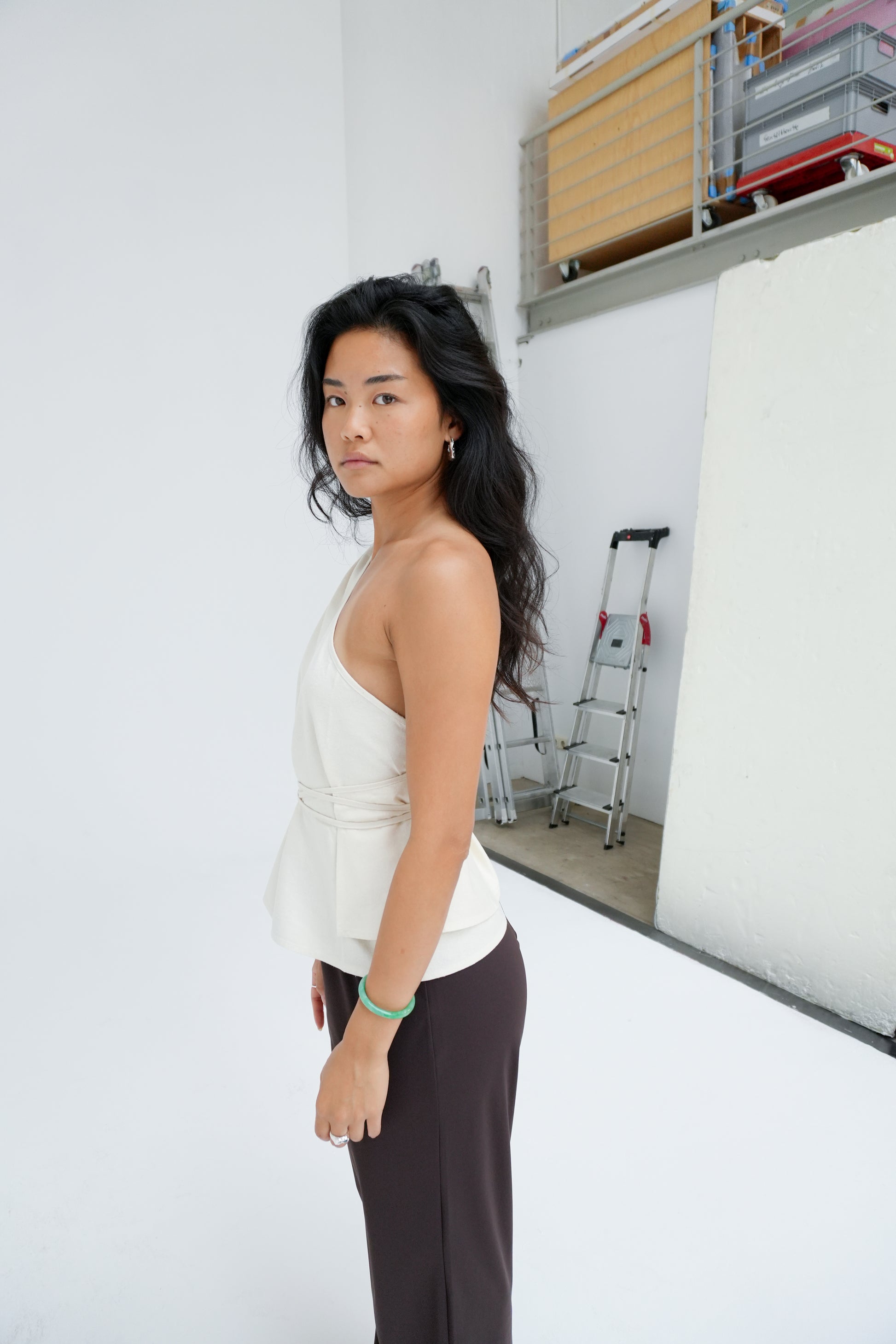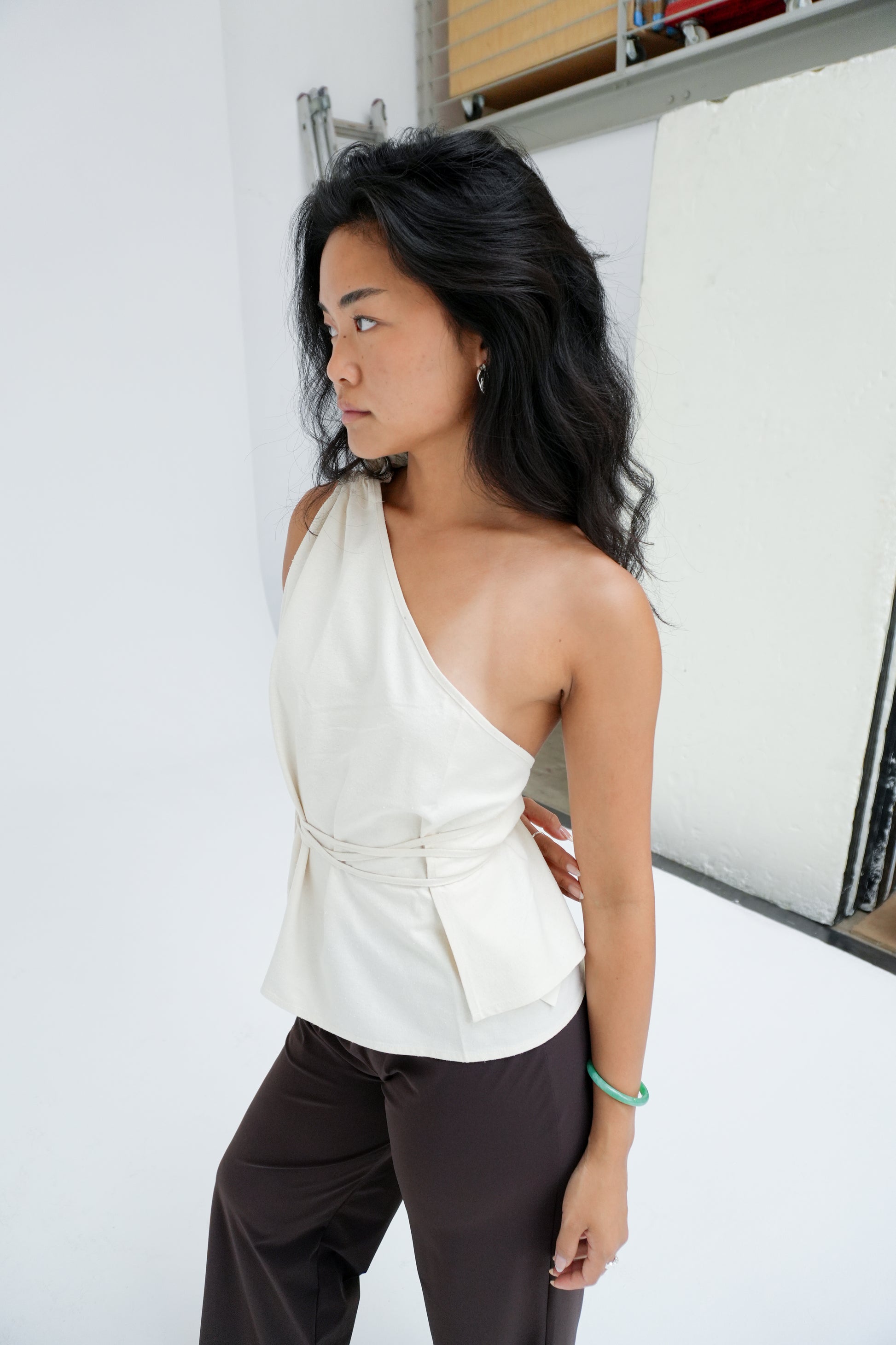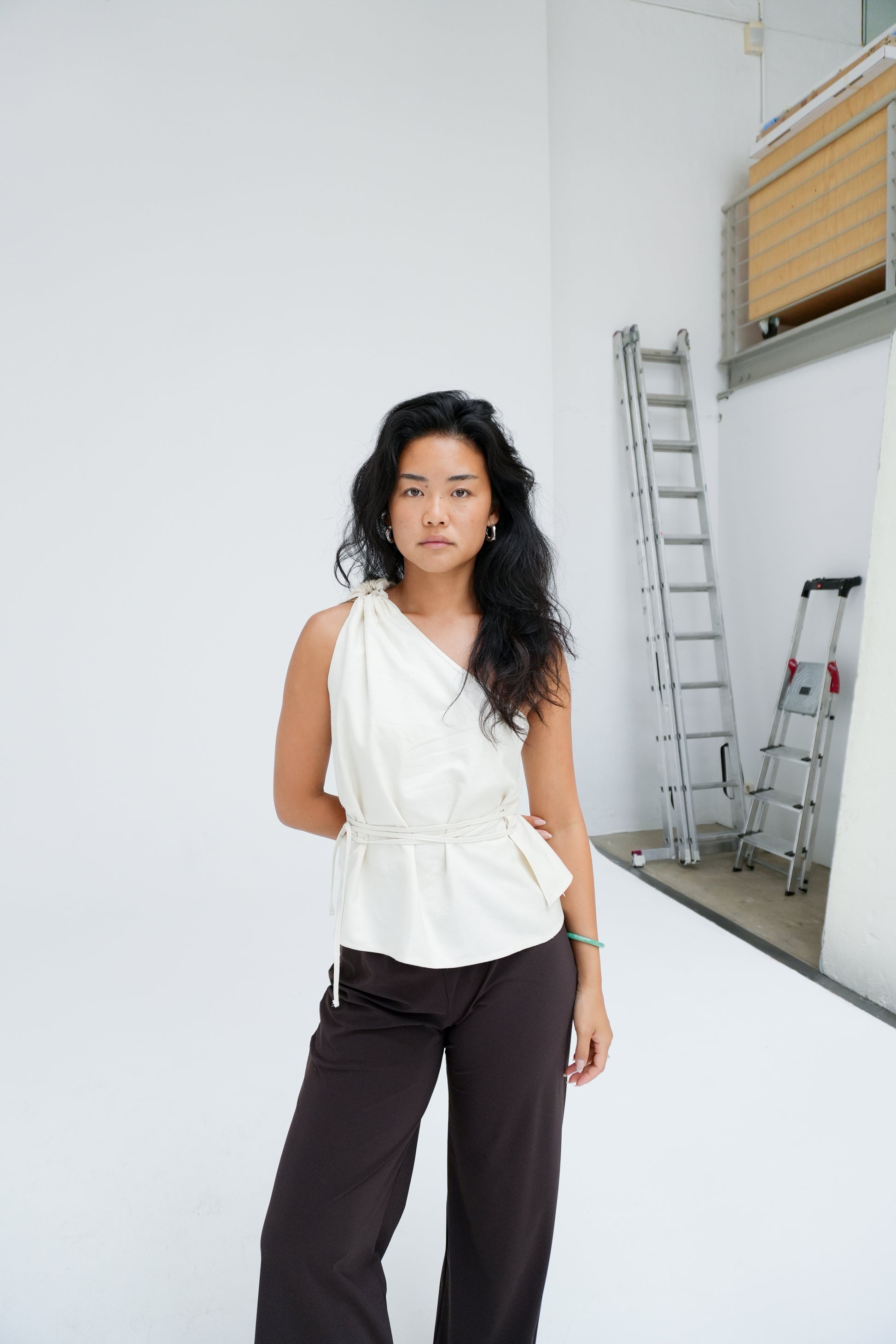 Asymmetrical wrap top made from wild silk. This top feature bands on neck and waist.