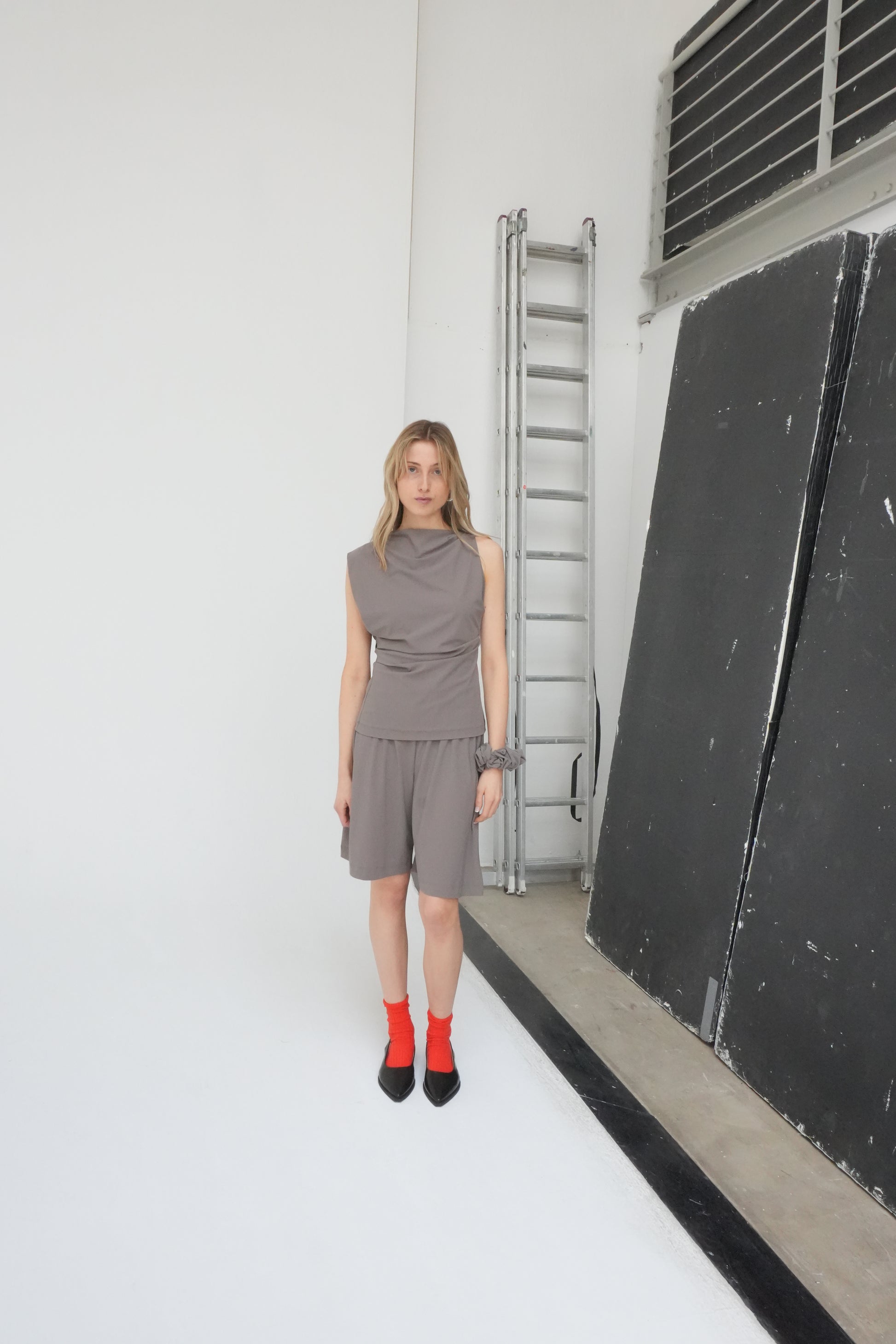 This wide-fit shorts with a relaxed silhouette and a subtle elasticated waistband for comfort. Made from recycled Italian stretch fabric. Perfectly balancing our form-fitting tops, wear these shorts with our Asymmetric sleeveless top for an elevated look.