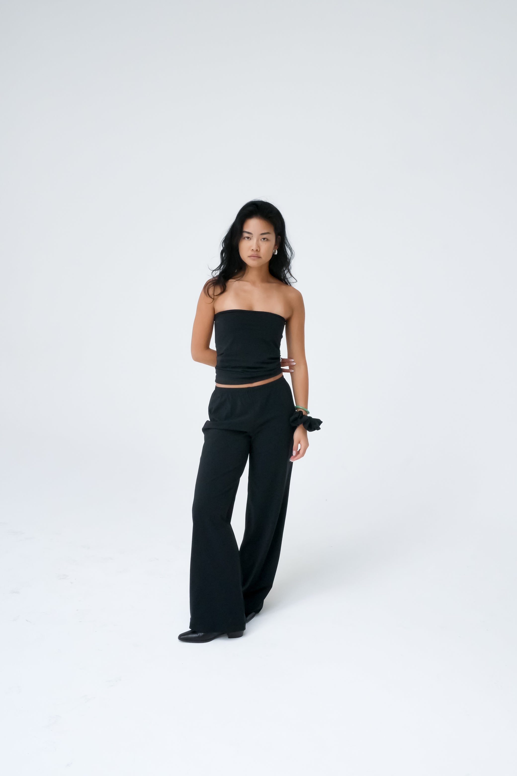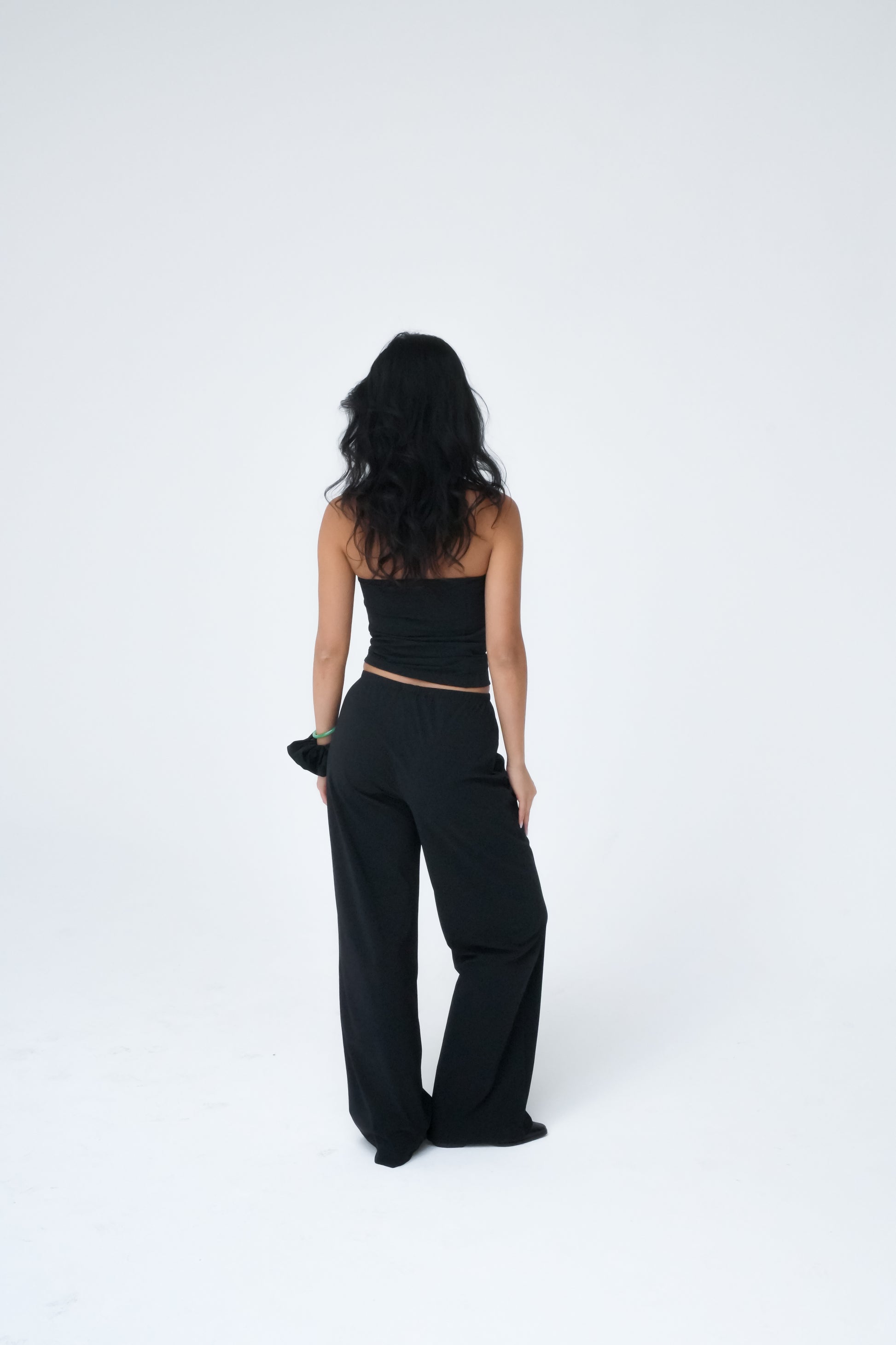 Wide-fit pants with a relaxed silhouette and a subtle elasticated waistband for comfort. Made from recycled Italian stretch fabric. Perfectly balancing our form-fitting tops, wear these pants with our Asymmetric sleeveless top for an elevated look.
