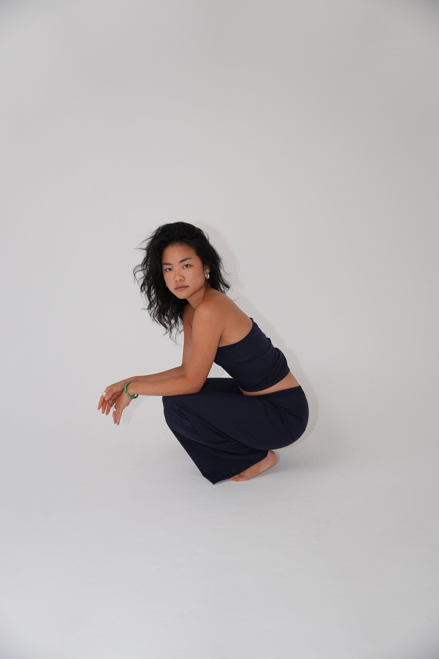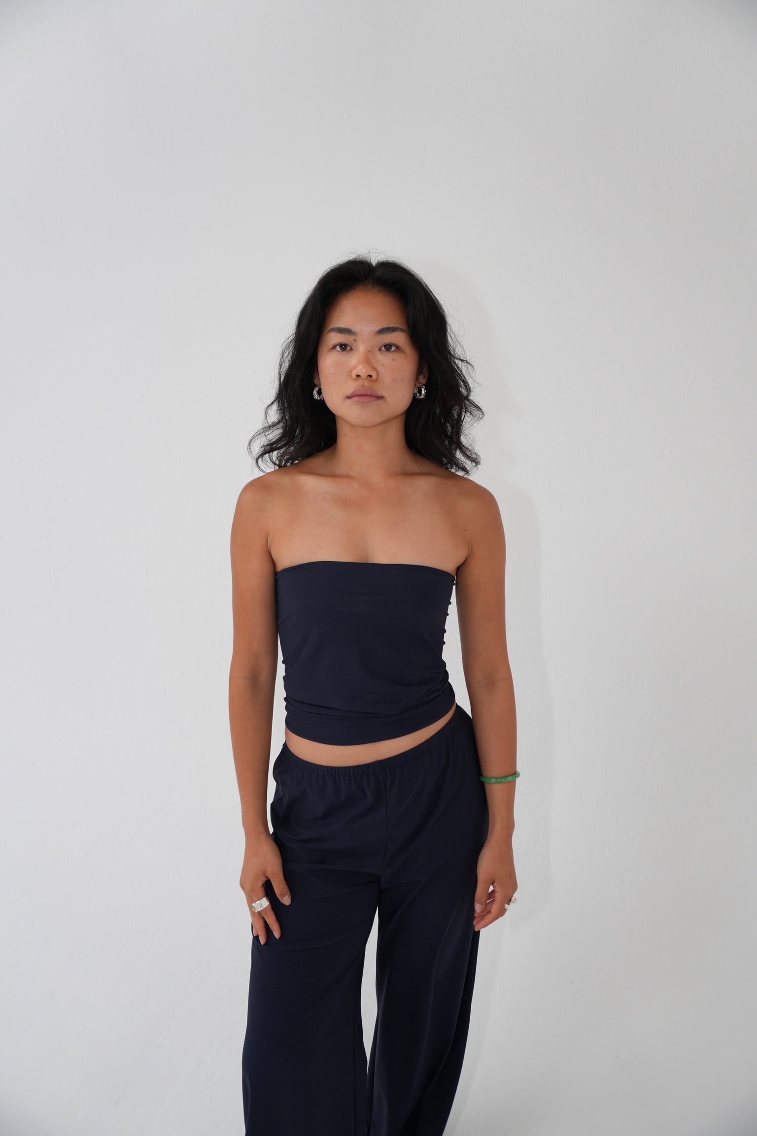 Wide-fit pants with a relaxed silhouette and a subtle elasticated waistband for comfort. Made from recycled Italian stretch fabric. Perfectly balancing our form-fitting tops, wear these pants with our Asymmetric sleeveless top for an elevated look.