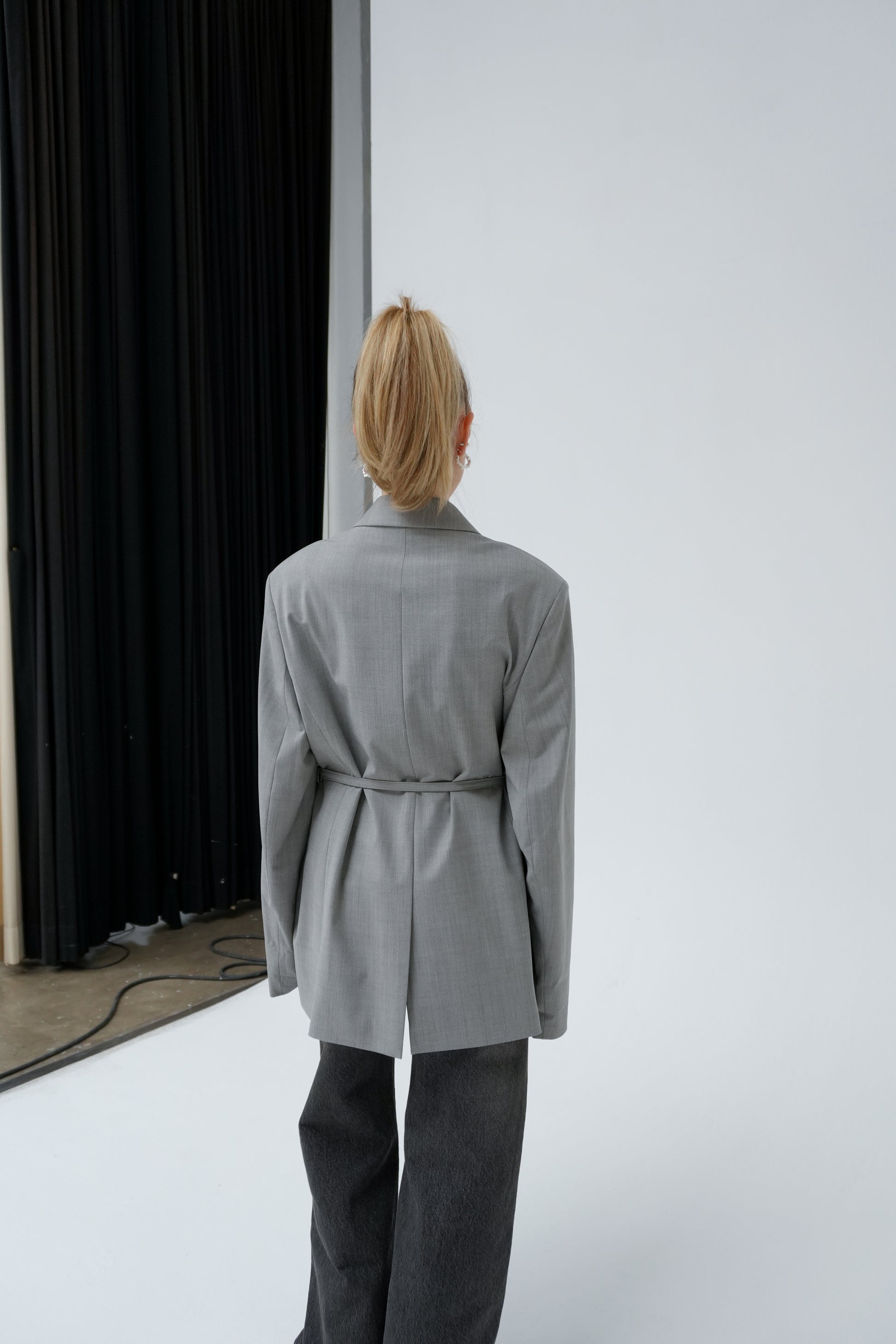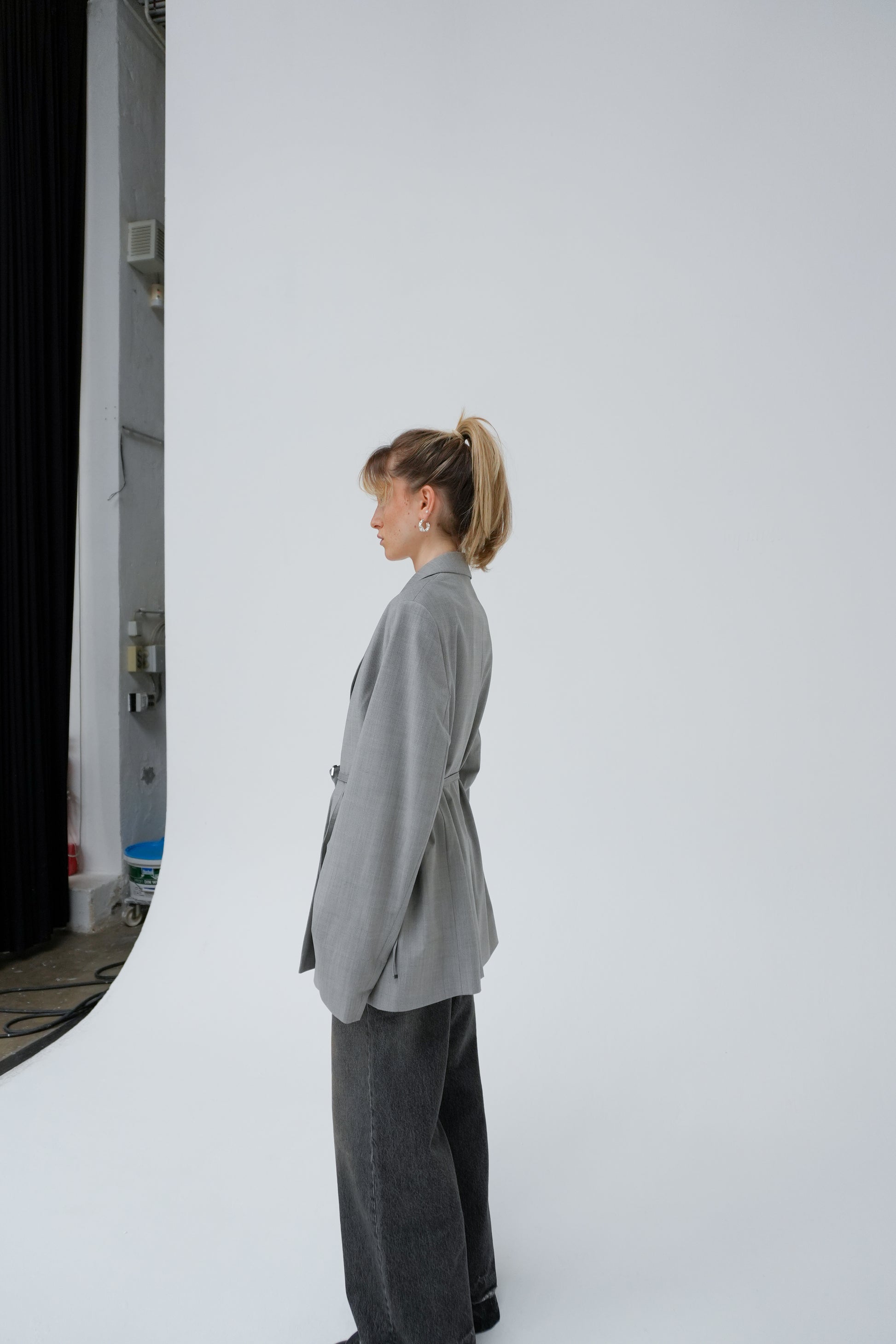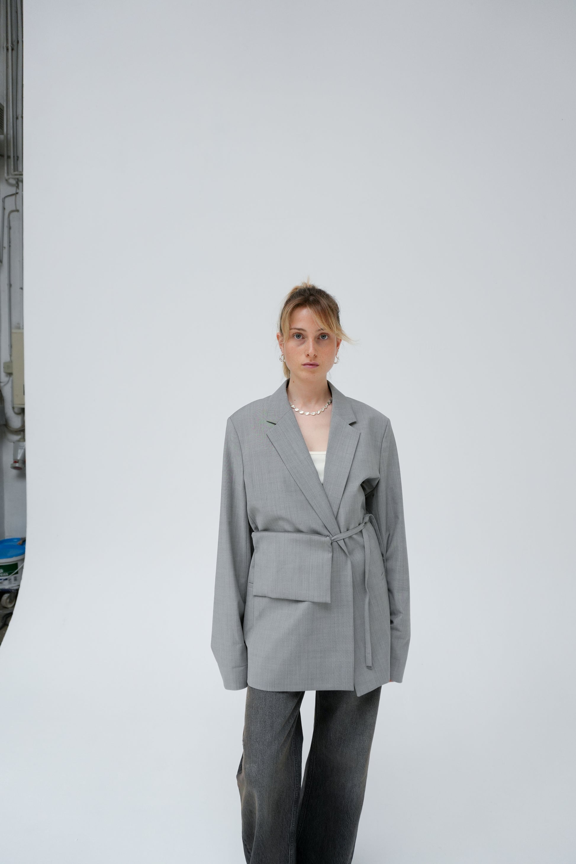 Wincham_1 is a blazer with a relaxed fit and drop lapels. A side tie belt creates an asymmetrical silhouette. The striking front pocket is removable, making for a versatile design statement. The bi-elastic fabric has good breathability and is comfortable to wear thanks to its wool content. The elastane content ensures good stretch and flexibility. The technical properties ensure that the fabric is particularly crease-resistant.