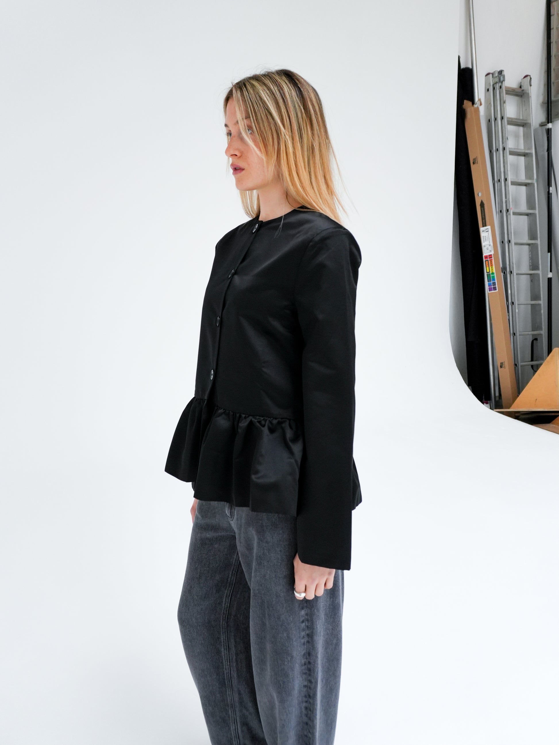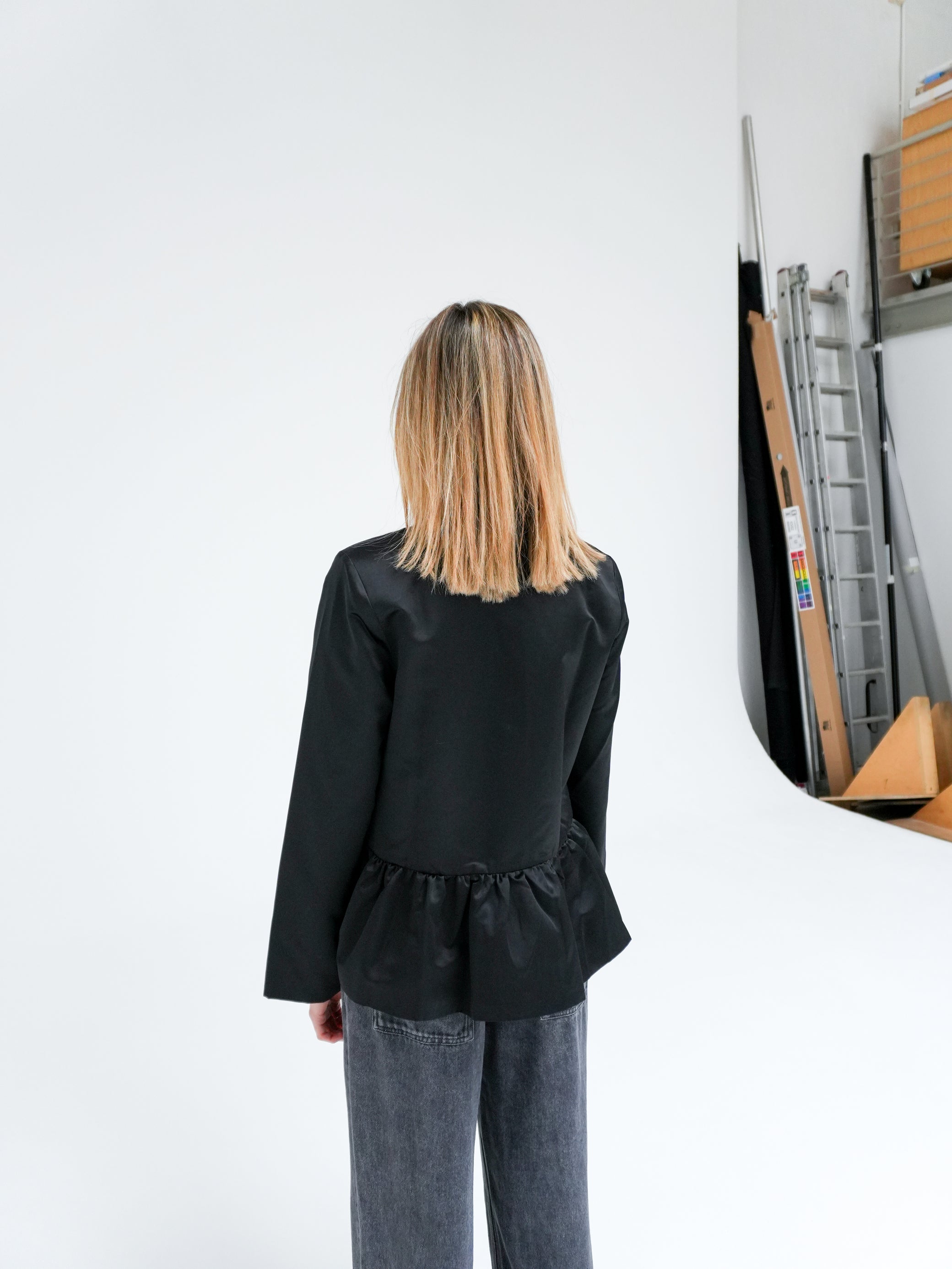 The Yuna Jacket is crafted from 100% recycled polyester. This elegant black jacket features a flattering waistline with a gentle flare, finished with long sleeves and a minimal round neckline. It closes at the front with buttons, making it a versatile piece that blends polished structure with playful detail.