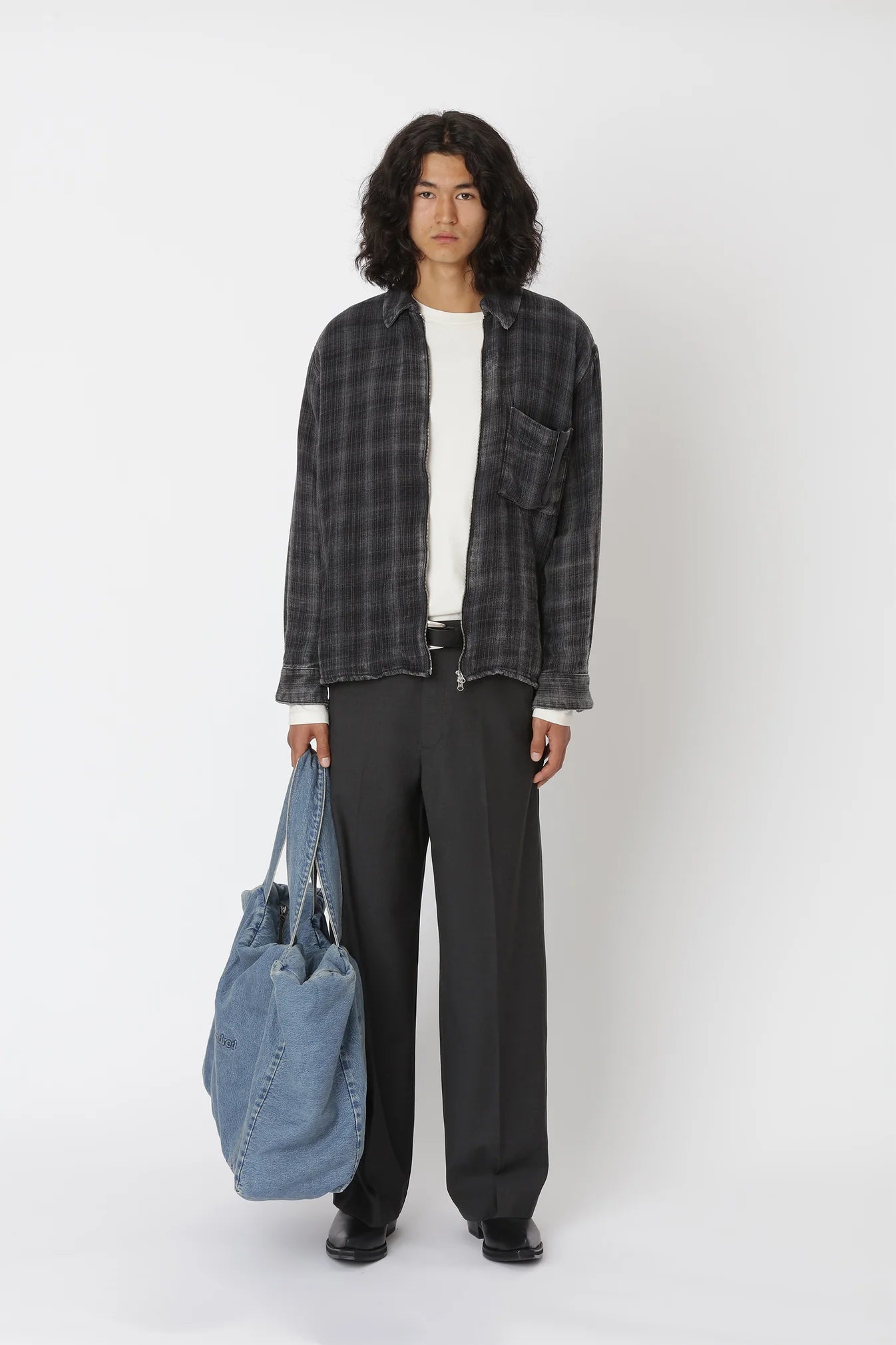 The Zayne Shirt features an oversized fit and is crafted from 100% cotton in a washed check pattern for a lived-in aesthetic. It is finished with a front zip closure and a low-set front pocket, adding a utilitarian edge to the relaxed silhouette.